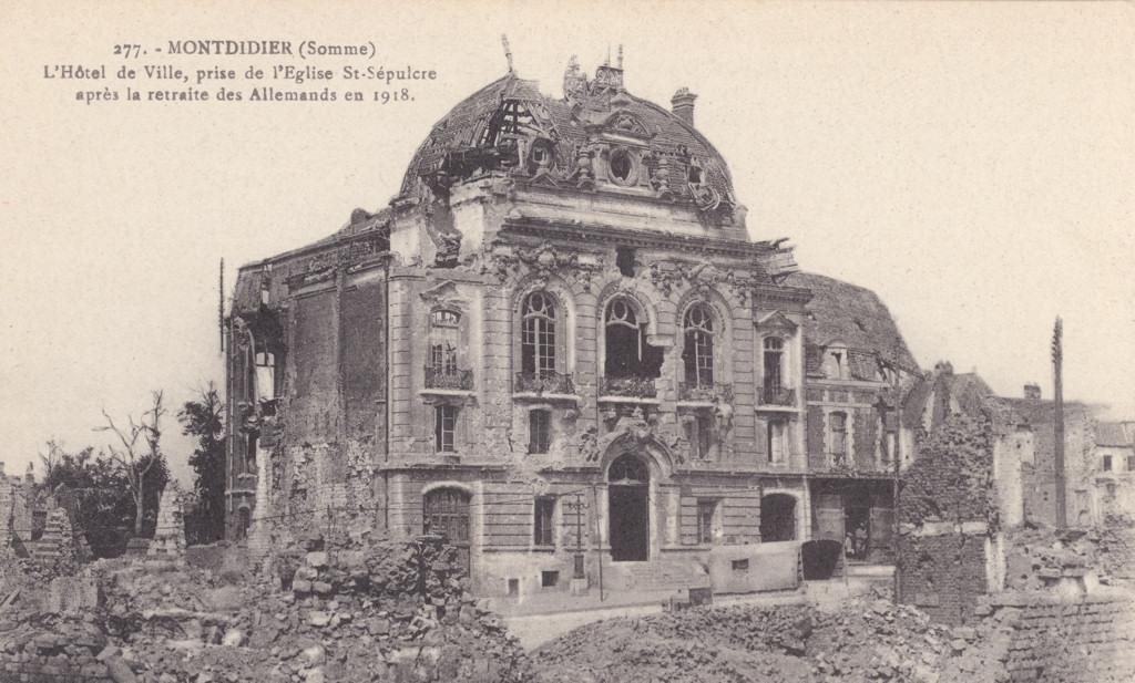 | Légende principale | 277. - MONTDIDIER (Somme L'Hôtel de Ville, prise de l'Eglise St-Sépulcre après la retraite des Allemands en 1918. |